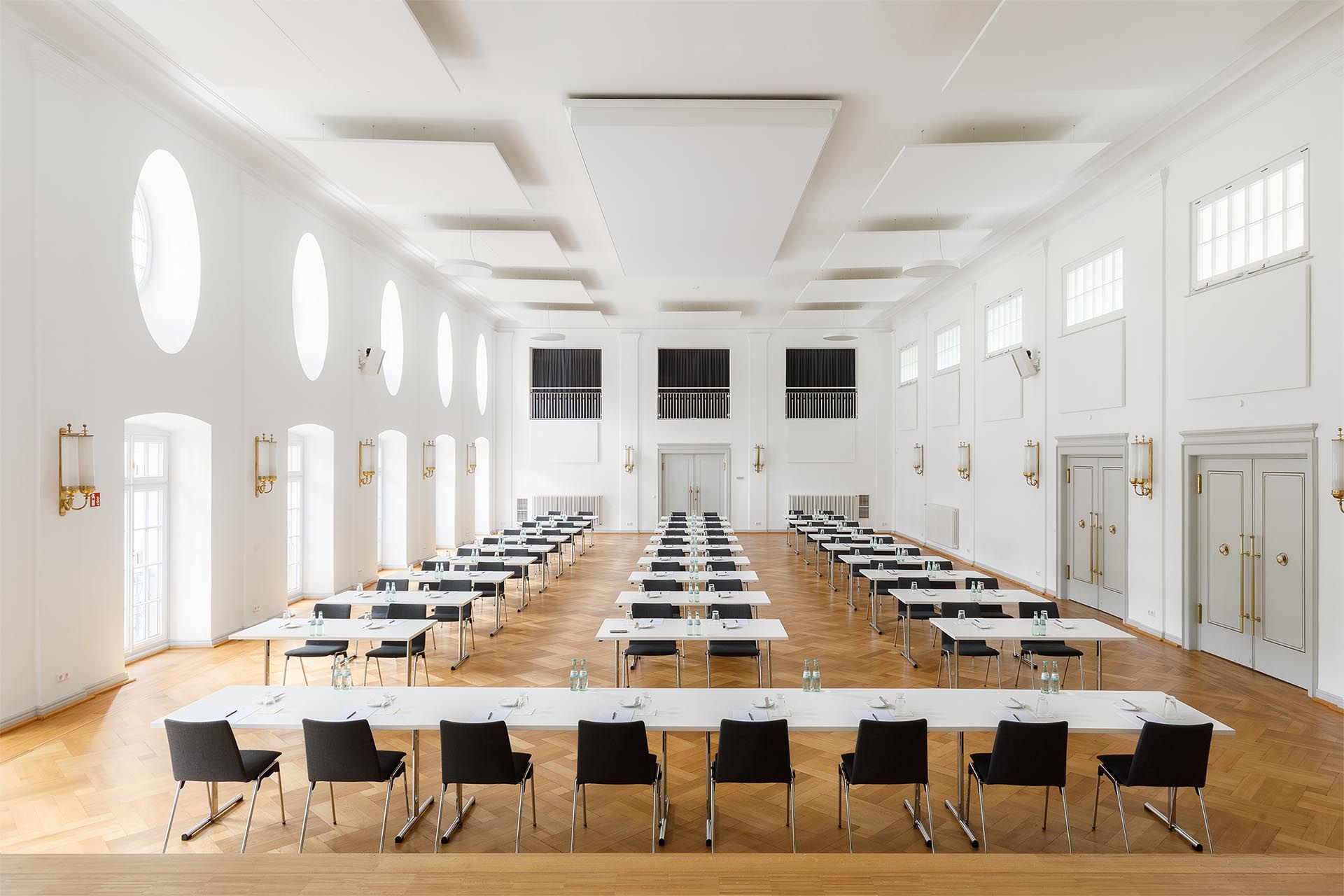 Für größere Tagungen und Konferenzen bietet der angrenzende KulturRaum Bad Bertrich den idealen Rahmen. Das Herzstück bildet der beeindruckende Kursaal mit einer Fläche von 276 m² und Platz für bis zu 290 Gäste, abhängig von der Bestuhlung. Die Bühne mit 42,44 m² und die moderne technische Ausstattung schaffen optimale Bedingungen für Präsentationen, Konferenzen und Events jeder Art. Ob Firmenveranstaltung, Kongress oder Gala-Abend – der Kursaal bietet Flexibilität und professionelle Ausstattung für ein gelungenes Event in der einzigartigen Atmosphäre von Bad Bertrich. Mit großen, bodentiefen Fenstern ist der Saal lichtdurchflutet und die ideale Location für Ihre Veranstaltung.